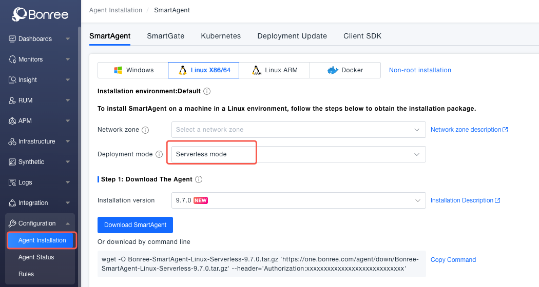 Bonree ONEplatform, go to the Configuration > Agent Installation page, and select Serverless Mode as the deployment mode.