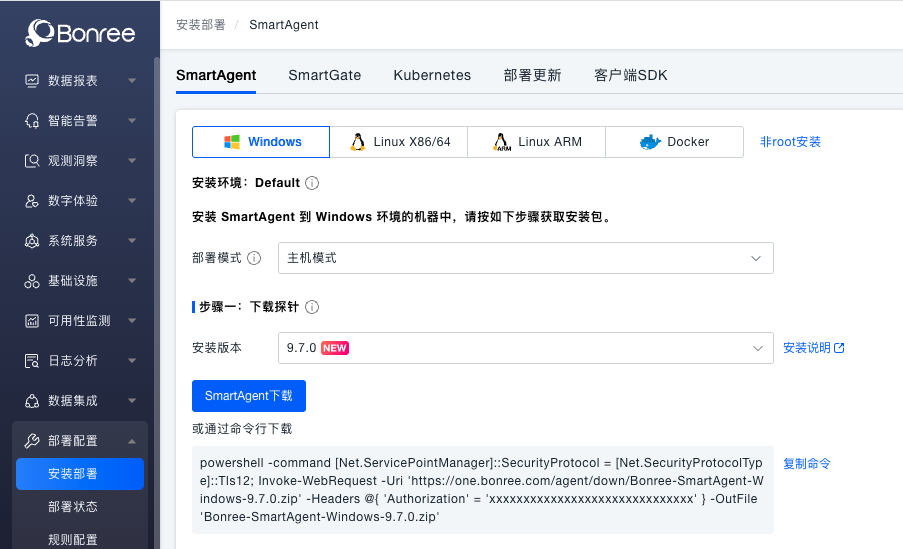 SmartAgent-Windows对应 CPU 架构的安装包:powershell -command [Net.ServicePointManager]::SecurityProtocol = [Net.SecurityProtocolType]::Tls12; Invoke-WebRequest -Uri 'https://one.bonree.com/agent/down/Bonree-SmartAgent-Windows-<version>.zip' -Headers @{ 'Authorization' = '<token>' } -OutFile 'Bonree-SmartAgent-Windows-<version>.zip' -